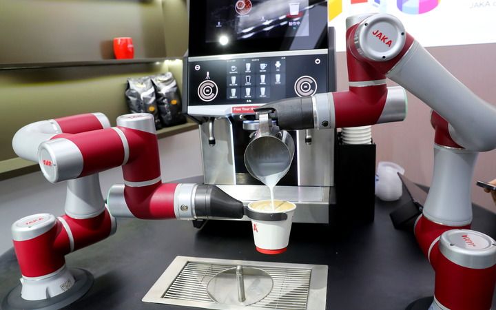 節(jié)卡機器人股份有限公司上海展廳內(nèi),機器人在表演調(diào)制咖啡(5月24日攝)。新華社記者 龔兵 攝