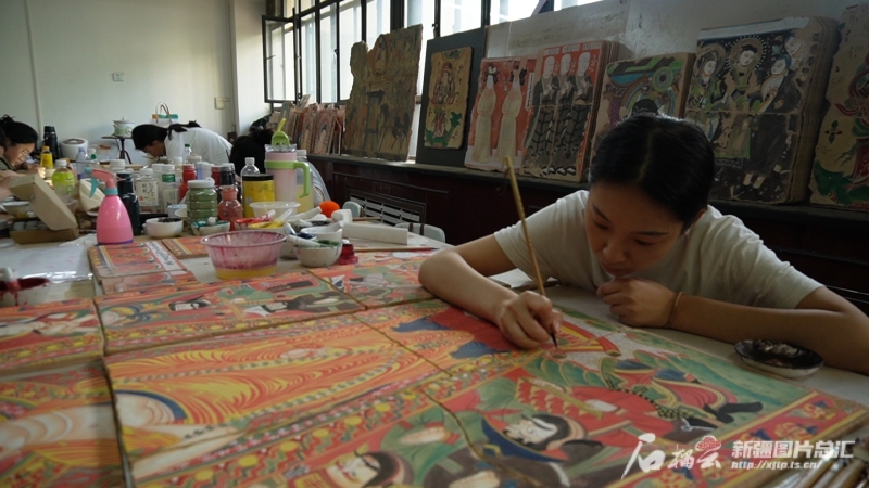 烏魯木齊市第八十三中學(xué)學(xué)生在龜茲壁畫工作坊臨摹作品。石榴云/新疆日報記者 宋海波攝