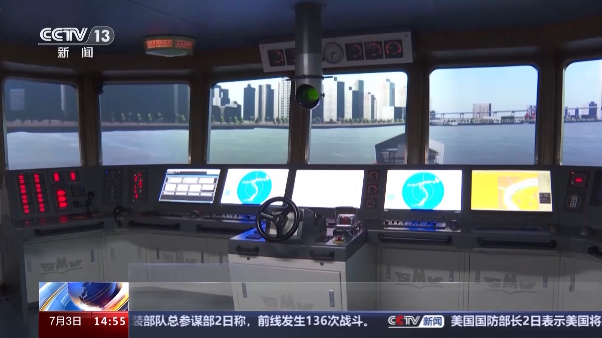 舵輪右手邊的手柄,用來控制主機(jī)轉(zhuǎn)速。操縱臺(tái)的左右兩邊,為雷達(dá)監(jiān)測(cè)顯示屏幕,代替人眼感知環(huán)境,在霧天航行、夜間航行時(shí)給駕駛員提供便利。它以大型集裝箱船駕駛室為原型,盡可能還原現(xiàn)代化船舶駕駛工作的真實(shí)場(chǎng)景。