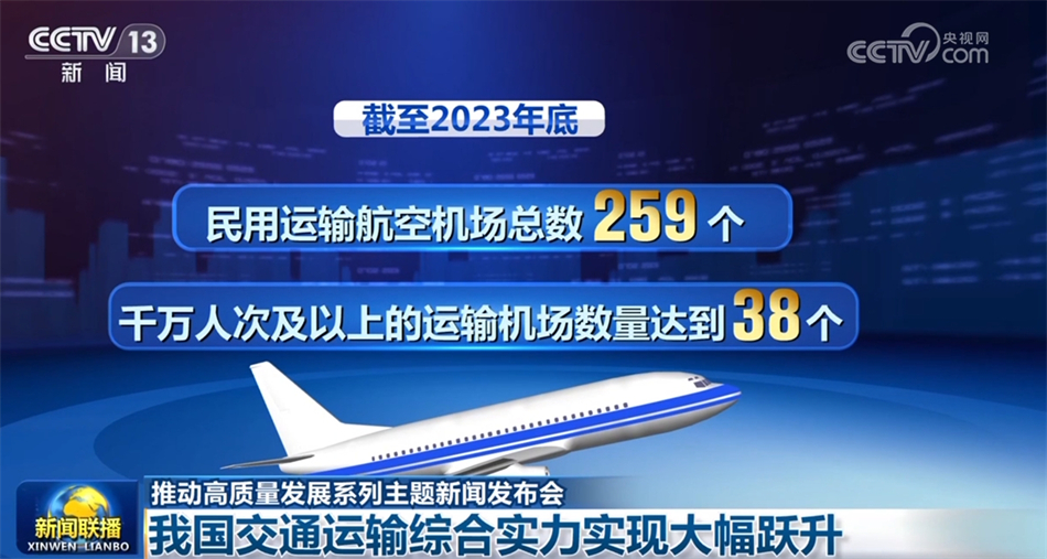 五年來,客貨運輸不斷發(fā)展,群眾出行更加舒適便捷,貨物運輸更加順暢高效。截至2023年底,我國鐵路營業(yè)里程15.9萬公里,其中高鐵營業(yè)里程4.5萬公里;全國公路里程543.68萬公里,其中高速公路里程18.36萬公里;民用運輸航空機場總數(shù)259個,千萬人次及以上的運輸機場數(shù)量達(dá)到38個。