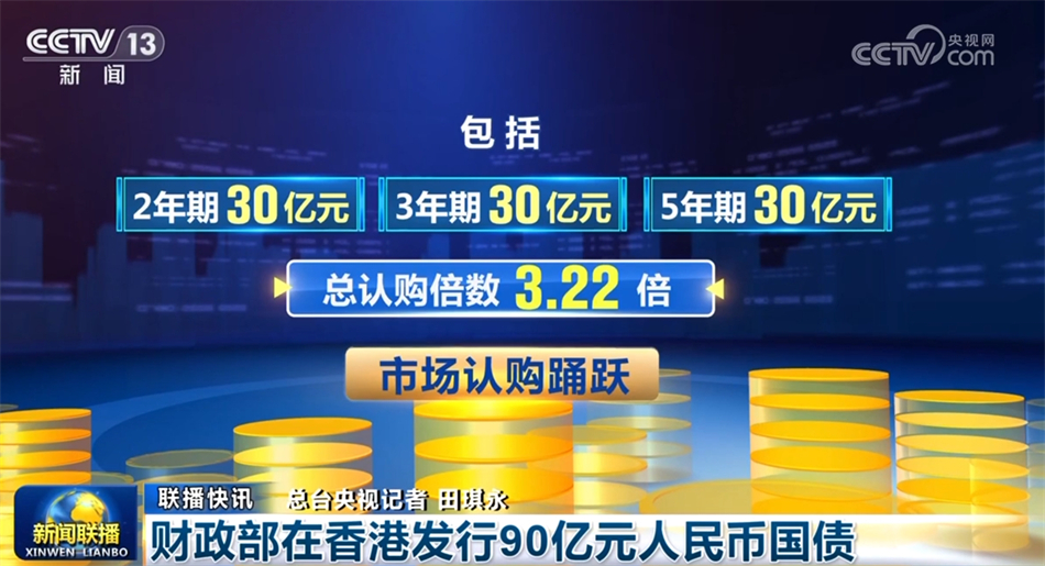 財政部7月10日在香港招標(biāo)發(fā)行2024年第三期人民幣國債,發(fā)行規(guī)模為90億元,包括2年期、3年期、5年期各30億元??傉J(rèn)購倍數(shù)3.22倍,市場認(rèn)購踴躍。今年財政部在香港計劃發(fā)行550億元人民幣國債,進一步完善常態(tài)化發(fā)行機制,支持鞏固提升香港國際金融中心地位。