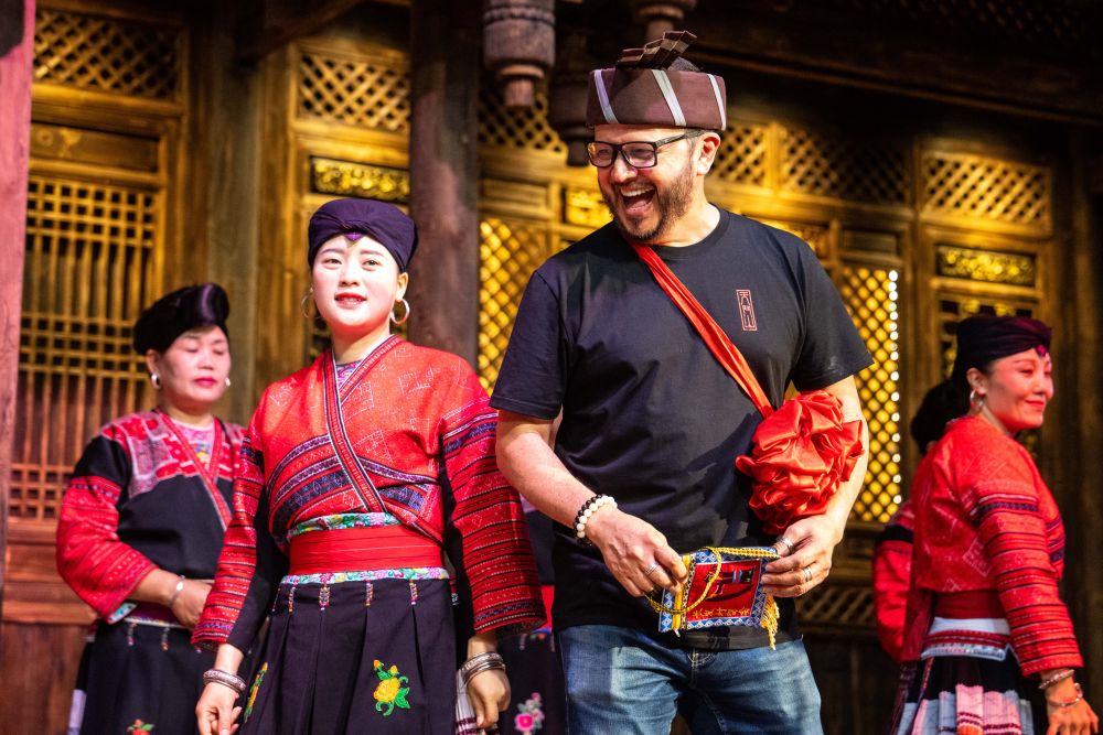 在廣西龍勝黃洛瑤寨,外國游客與村民演員在紅瑤民俗文化表演中互動(6月26日攝)。新華社記者 陳思汗 攝