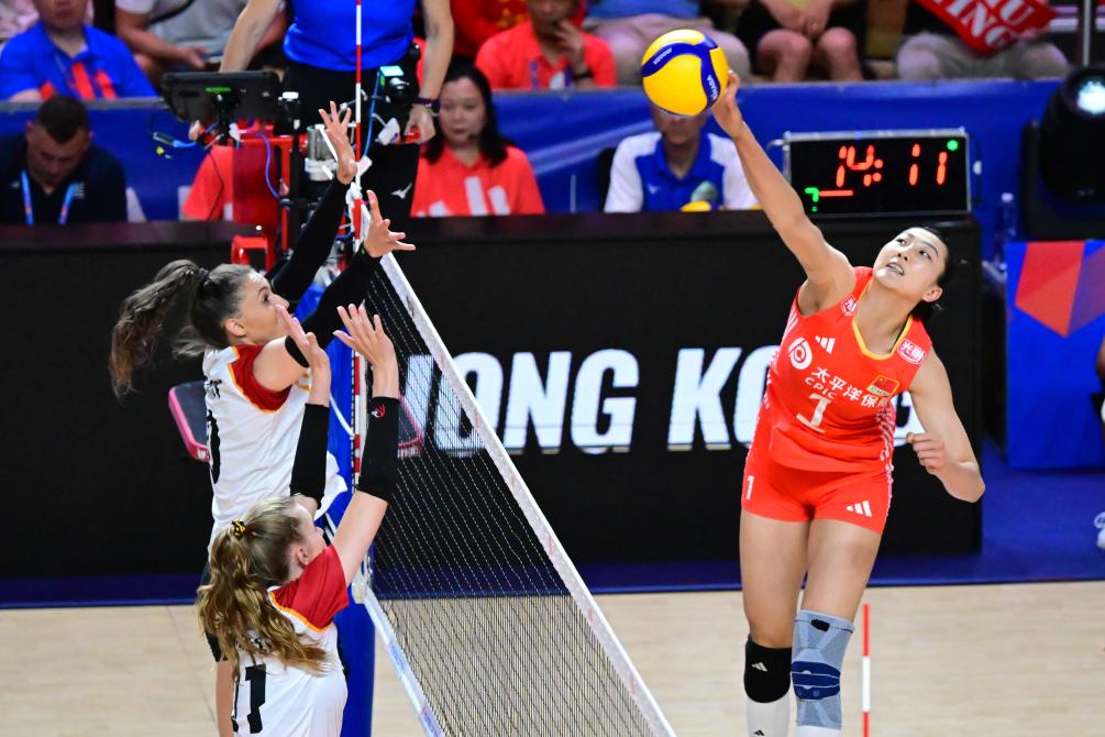 6月14日,中國隊(duì)球員袁心玥(右)在比賽中扣球。當(dāng)日,在世界女排聯(lián)賽中國香港站比賽中,中國隊(duì)3比0戰(zhàn)勝德國隊(duì)。新華社記者 朱煒 攝