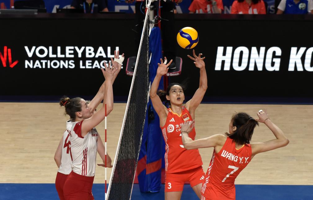6月16日,中國隊(duì)球員刁琳宇(右二)在比賽中傳球。當(dāng)日,在世界女排聯(lián)賽中國香港站比賽中,中國隊(duì)3比0戰(zhàn)勝波蘭隊(duì)。新華社記者 盧炳輝 攝
