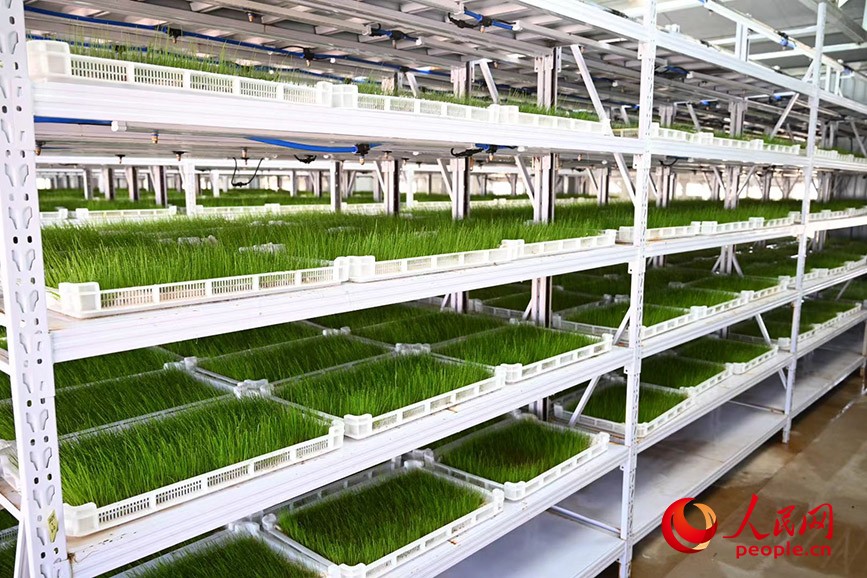 除了飼養(yǎng)蘇尼特羊的棚圈之外,牧場中還設(shè)計(jì)了一座溫室房,里面整齊排列的架子上,種植著郁郁蔥蔥的燕麥草,這里被牧民親切地稱為“空中牧場”。
