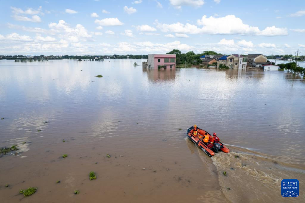 7月29日,在涓水湘潭縣河口鎮(zhèn)華中村堤段附近,搶險人員搜尋被困群眾(無人機(jī)照片)。新華社記者 陳思汗 攝