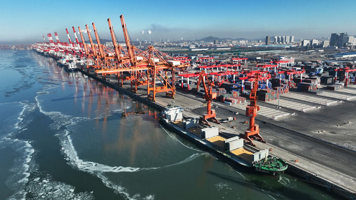 貨船在遼寧營(yíng)口港碼頭裝運(yùn)糧食(2024年1月10日攝,無人機(jī)照片)。