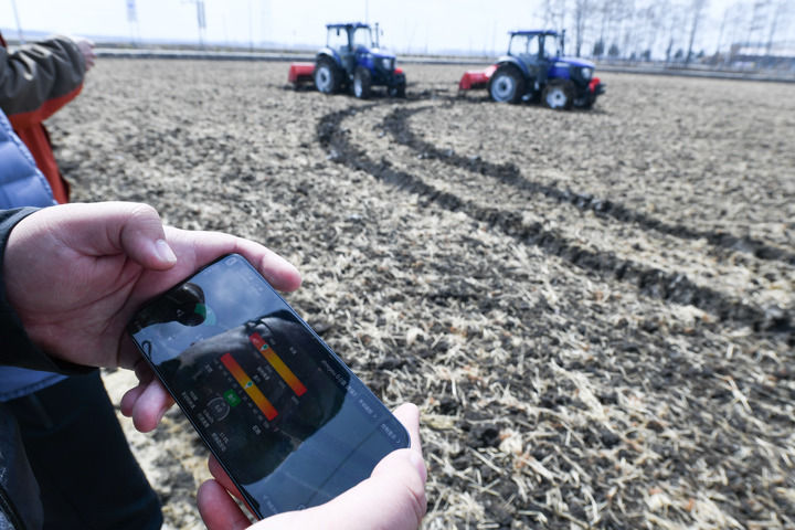 在黑龍江北大荒農(nóng)業(yè)股份有限公司友誼分公司智慧農(nóng)場(chǎng)的地塊內(nèi),技術(shù)人員操作兩輛拖拉機(jī)進(jìn)行無人駕駛測(cè)試(2024年4月3日攝)。