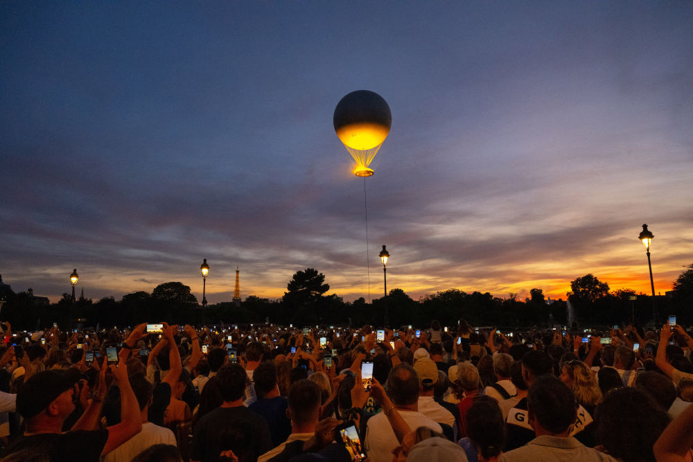 歷史建筑與現(xiàn)代藝術(shù)的融合彰顯法式浪漫。埃菲爾鐵塔上的燈光秀劃破夜空。特羅卡德羅廣場(chǎng)上,神秘人將火炬交給法國(guó)傳奇球星齊達(dá)內(nèi),不久后,杜樂麗花園內(nèi)的主火炬——一個(gè)直徑7米的火焰環(huán),頂部是一個(gè)高30米、直徑22米的系留氣球,被“點(diǎn)燃”。