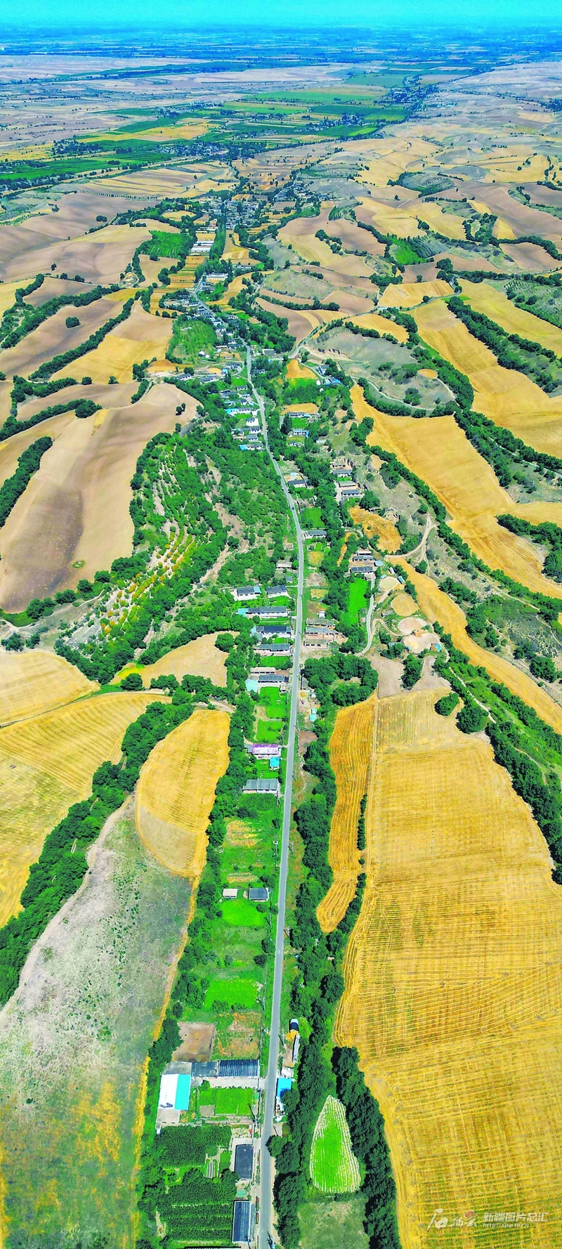 俯瞰博樂市小營盤鎮(zhèn)呼和布熱村一角(8月8日無人機攝)。放眼該村,平坦的農(nóng)村公路、綠色的條田、整齊的村莊,形成一幅美麗的鄉(xiāng)村畫卷。 賀程攝