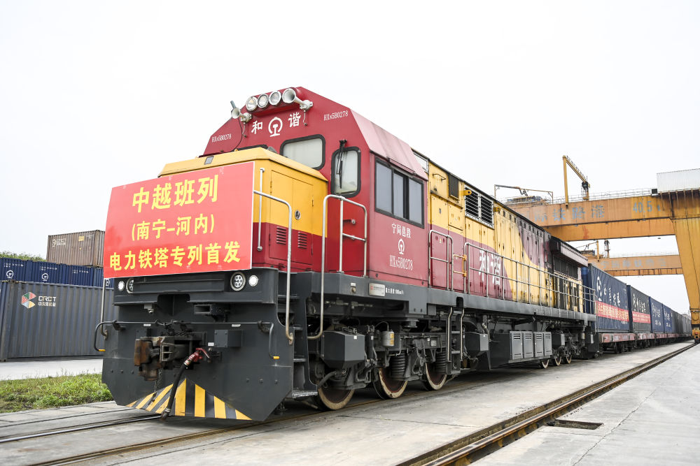 3月8日上午,一列滿載340噸電力鐵塔的中越班列從南寧國(guó)際鐵路港開出,發(fā)往越南河內(nèi)。這是廣西首次開行電力鐵塔專列。新華社記者曹祎銘 攝