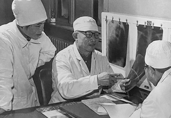 1980年1月16日,中日友好醫(yī)院首任院長(zhǎng)辛育齡(中)在內(nèi)蒙古結(jié)核病院與胸外科醫(yī)師討論病例(翻拍照片)。 新華社發(fā)