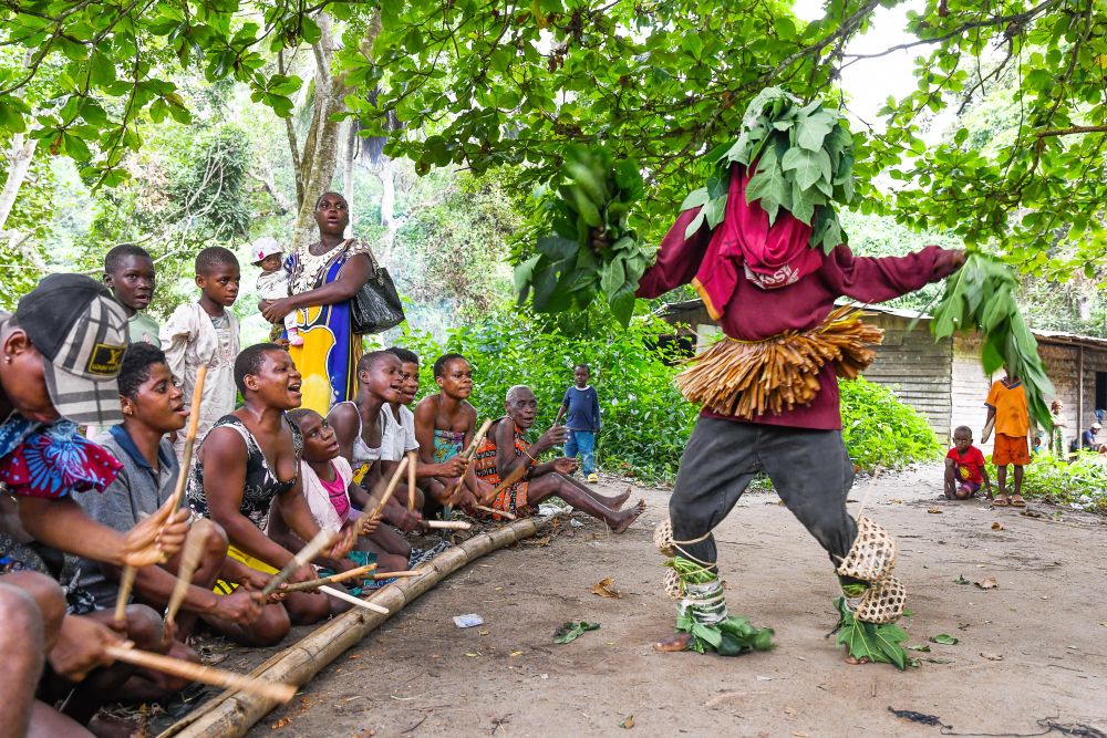 7月11日,在喀麥隆南部大區(qū)克里比市,恩杜馬萊村的俾格米人村民舉行慶?;顒?dòng)。新華社發(fā)(科普索攝)