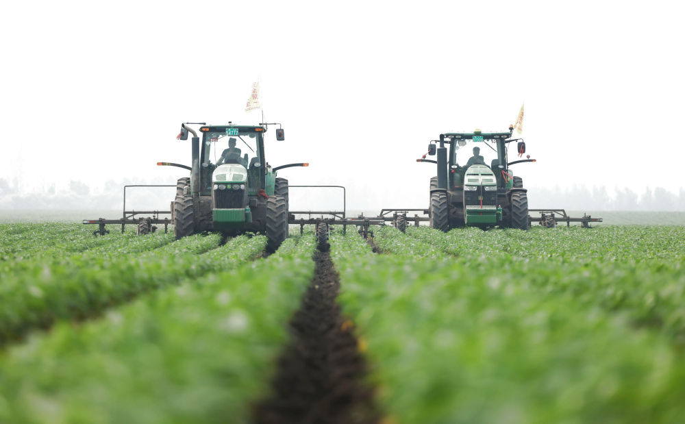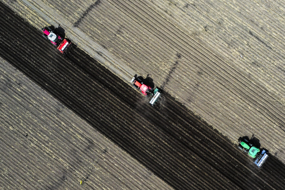 2024年6月25日,大型農(nóng)機(jī)在黑龍江北大荒集團(tuán)鶴山農(nóng)場(chǎng)作業(yè),為土壤增溫放寒(無(wú)人機(jī)照片)。今年,黑龍江推進(jìn)高標(biāo)準(zhǔn)農(nóng)田建設(shè)、侵蝕溝治理和農(nóng)田防護(hù)林更新修復(fù)一體化實(shí)施,建設(shè)高標(biāo)準(zhǔn)農(nóng)田1400萬(wàn)畝、治理侵蝕溝1.2萬(wàn)條,全面加強(qiáng)黑土地保護(hù)利用。