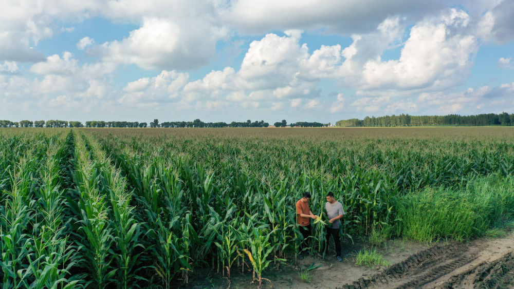 2024年8月8日,在吉林省梨樹縣孤家子鎮(zhèn)兩家子村,當(dāng)?shù)剞r(nóng)業(yè)發(fā)展服務(wù)站高級(jí)農(nóng)藝師蘭雨壯(左)與四平市強(qiáng)盛農(nóng)機(jī)農(nóng)民專業(yè)合作社負(fù)責(zé)人查看玉米長(zhǎng)勢(shì)(無(wú)人機(jī)照片)。多年來(lái),地處世界“黃金玉米帶”的全國(guó)產(chǎn)糧大縣吉林省梨樹縣,強(qiáng)化科技在農(nóng)業(yè)生產(chǎn)中的支撐作用,持續(xù)提升糧食和重要農(nóng)產(chǎn)品穩(wěn)產(chǎn)保供能力。
