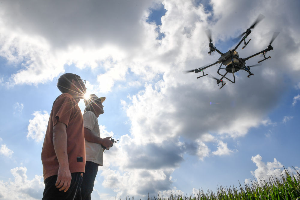 2024年8月8日,在吉林省梨樹縣孤家子鎮(zhèn),當(dāng)?shù)剞r(nóng)業(yè)發(fā)展服務(wù)站高級(jí)農(nóng)藝師蘭雨壯(左)查看無(wú)人機(jī)作業(yè)情況。