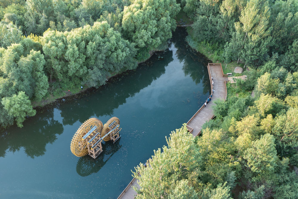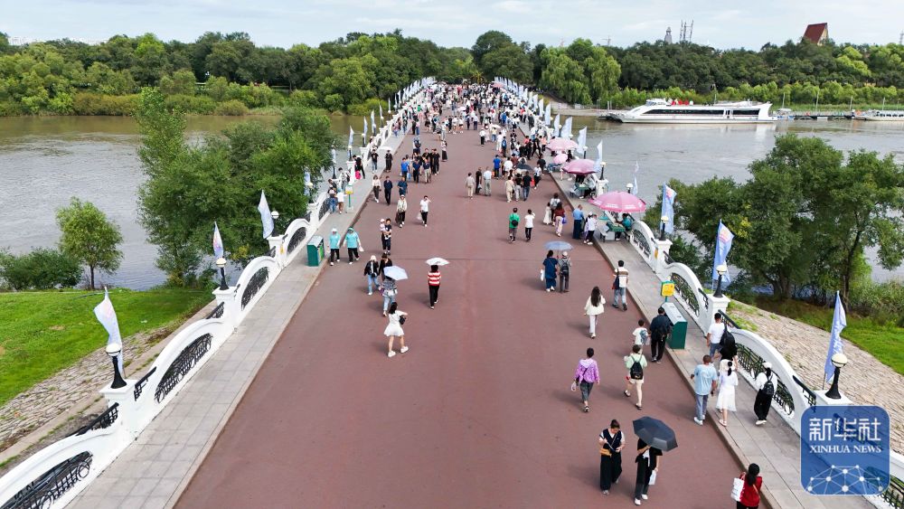 人們?cè)邶埥ぜ瘓F(tuán)綏棱林業(yè)局生態(tài)文化旅游景區(qū)一處公園游覽(7月25日攝,無人機(jī)照片)。