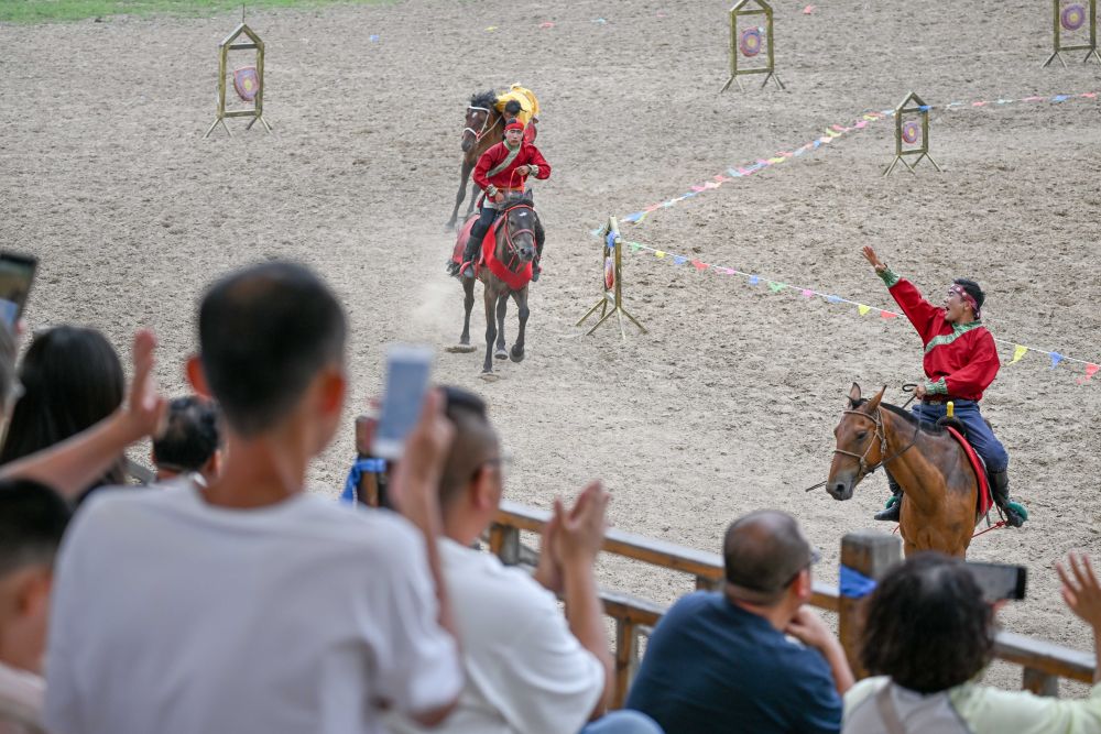 8月8日,游客在內(nèi)蒙古興安盟科爾沁右翼前旗烏蘭毛都草原觀看馬術(shù)實(shí)景劇。