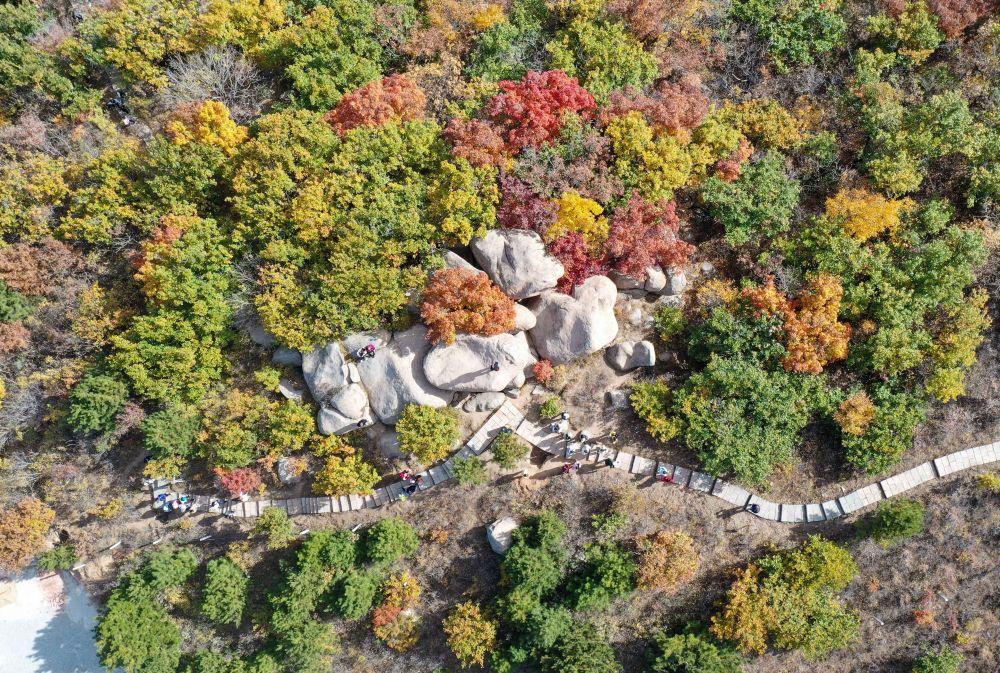 游客在遼寧阜新的海棠山游覽(2023年10月19日攝,無人機(jī)照片)。