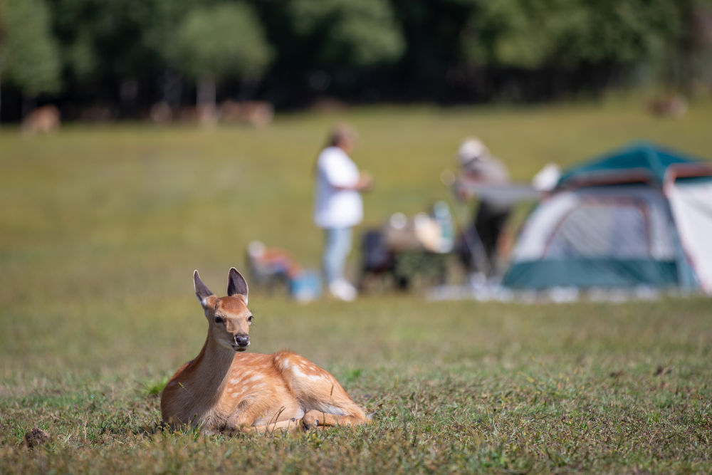 8月27日,在黑龍江伊春市上甘嶺溪水國家森林公園鹿溪牧場(chǎng),一只鹿在草坪上休息。