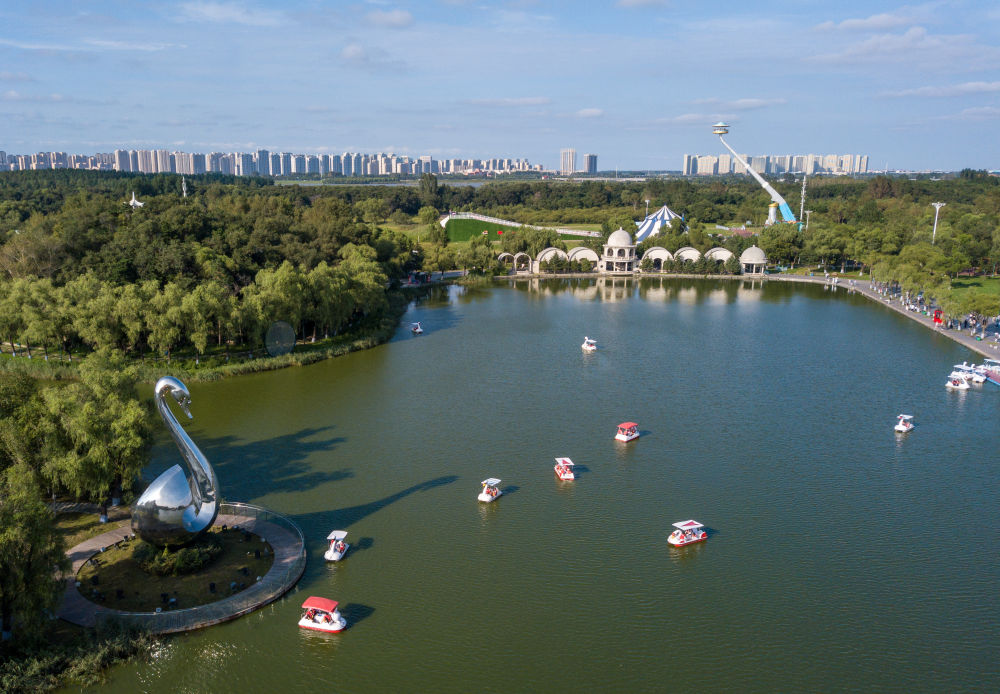 8月20日,游客在黑龍江哈爾濱太陽島風(fēng)景區(qū)太陽湖上乘船游覽(無人機(jī)照片)。