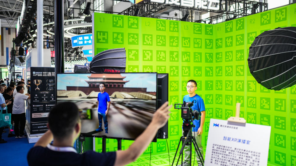 ↑8月28日,參觀者在數(shù)博會展館內體驗智能XR演播室。