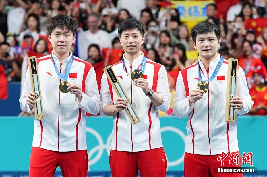 在巴黎奧運(yùn)會乒乓球男團(tuán)金牌賽中,中國隊(duì)以3比0戰(zhàn)勝瑞典隊(duì),獲得冠軍。中新社記者 趙文宇 攝
