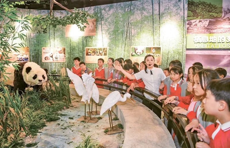 新時代以來,教育系統(tǒng)著力推動思想政治教育、專業(yè)教育與創(chuàng)新教育、社會實踐、志愿服務(wù)等的融合。圖為2024年5月17日,學(xué)生們在江西宜豐熊貓科技館開展“行走的思政課”主題科普教育活動,增強(qiáng)節(jié)約資源和保護(hù)自然環(huán)境意識。 人民圖片 周亮/攝