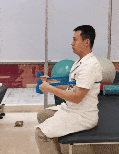坐位,將彈力帶置于身體前方,兩端纏繞于手上。身體保持正直,雙手拉動(dòng)彈力帶,緩慢做水平外展動(dòng)作,直到彈力帶呈繃緊狀態(tài)。然后,還原至初始姿勢(shì)。此為一個(gè)完整動(dòng)作。8~12次/組,做3組。