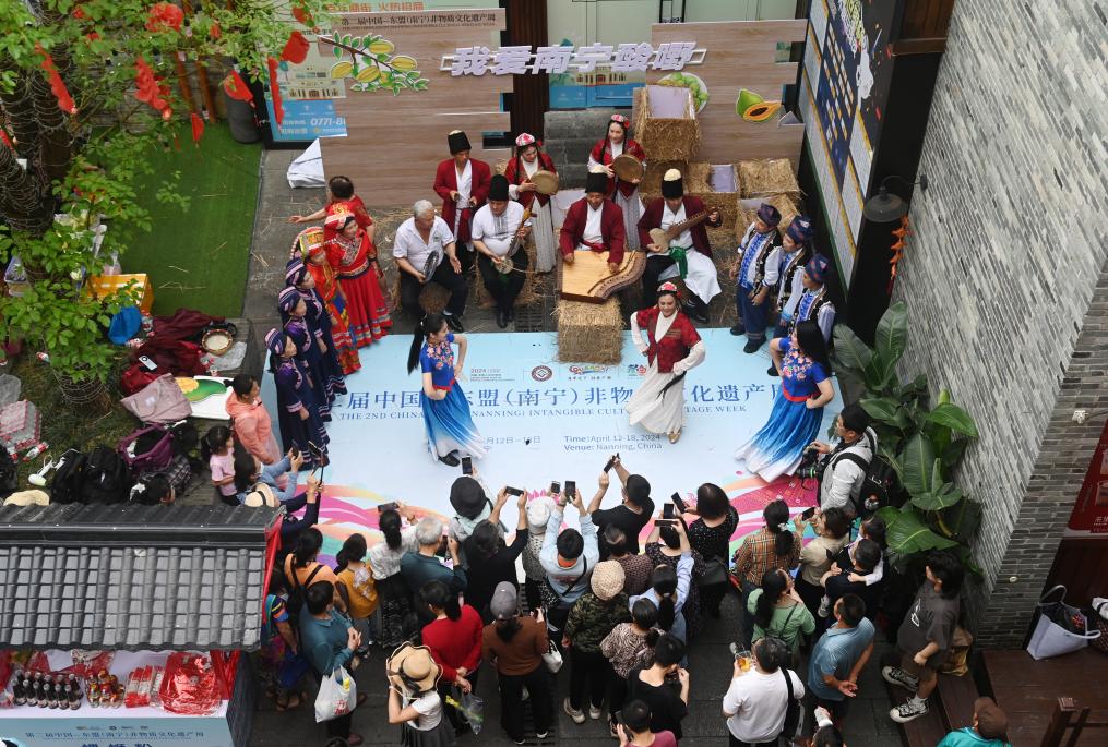今年“三月三”期間,在南寧市三街兩巷的慶祝活動現(xiàn)場,多彩非遺文化展演吸引游客駐足欣賞。新華社記者陸波岸 攝