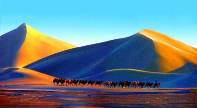 在巴丹吉林沙漠中行進(jìn)的駝隊(duì)。趙興忠攝