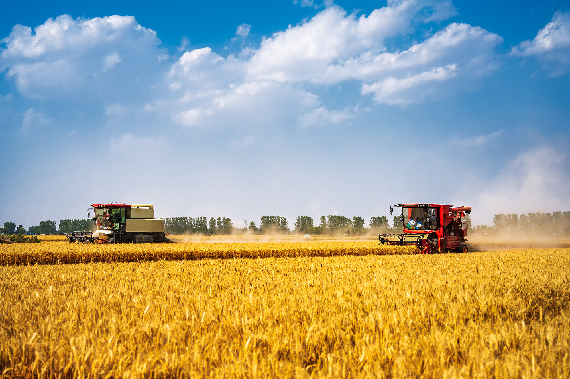 河南省鄭州市聯(lián)合收割機收割麥田場景