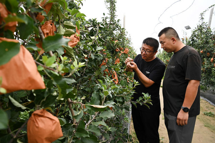 延安市安塞區(qū)果業(yè)技術(shù)推廣中心主任張剛(左)在果園觀察果樹(shù)長(zhǎng)勢(shì)(2024年8月8日攝)。新華社記者 鄒競(jìng)一 攝