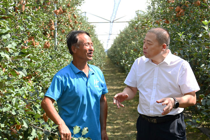 延安市洛川縣槐柏鎮(zhèn)黨委書記解賀宏(右)在果園與果農(nóng)交流(2024年8月5日攝)。新華社記者 鄒競(jìng)一 攝