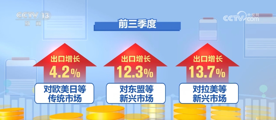 據(jù)海關(guān)統(tǒng)計(jì),今年前三季度,我國(guó)進(jìn)出口32.33萬(wàn)億元,同比增長(zhǎng)5.3%;其中出口18.62萬(wàn)億元,增長(zhǎng)6.2%;進(jìn)口13.71萬(wàn)億元,增長(zhǎng)4.1%。