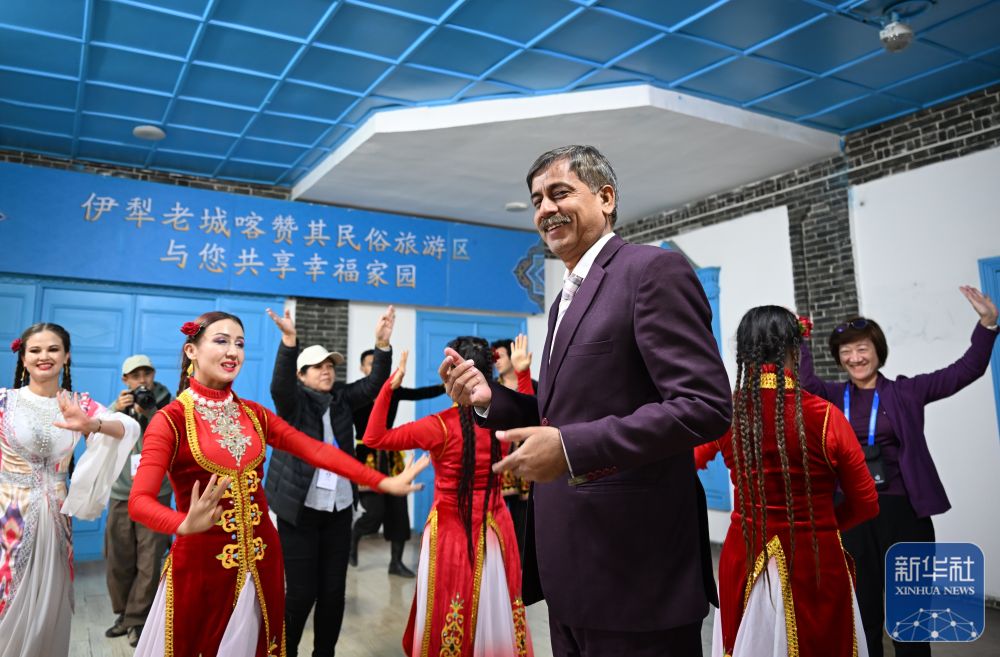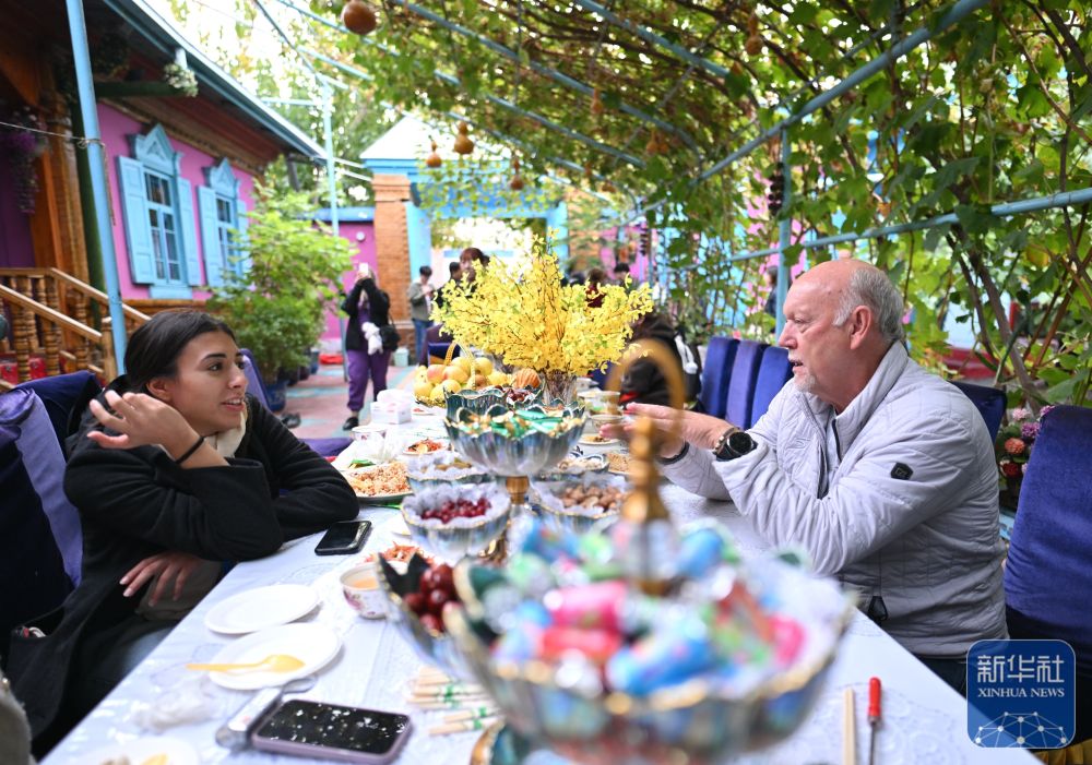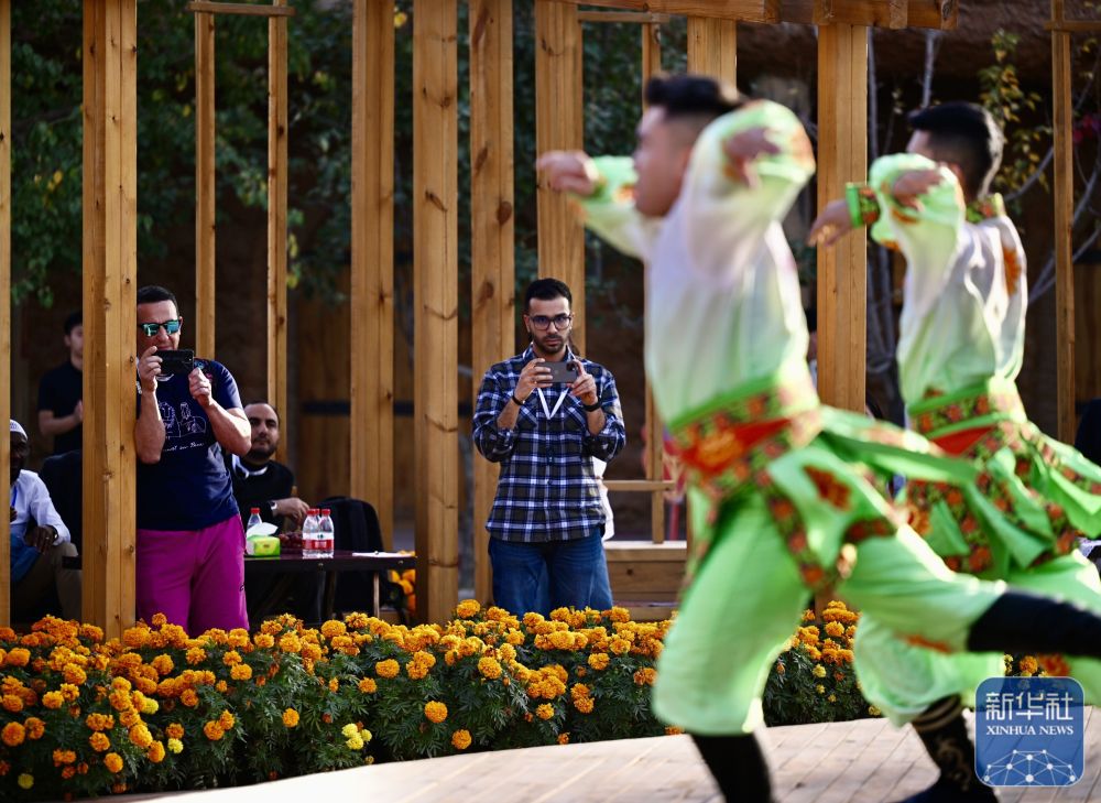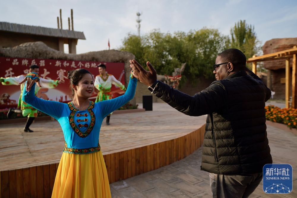 10月15日,與會(huì)嘉賓在伊寧市喀贊其民俗旅游區(qū)與表演者互動(dòng)。