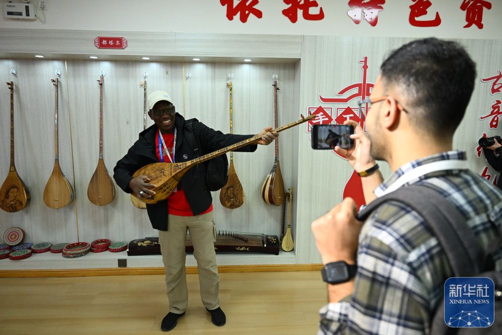 10月15日,與會(huì)嘉賓在阿克蘇地區(qū)新和縣加依村加依手工樂(lè)器產(chǎn)業(yè)園體驗(yàn)傳統(tǒng)樂(lè)器。
