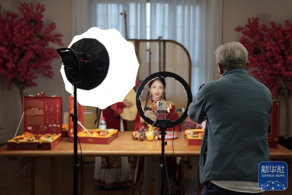 10月15日,與會(huì)嘉賓在阿克蘇地區(qū)新和縣加依村龜茲文化樂(lè)器展示中心觀看工作人員直播。