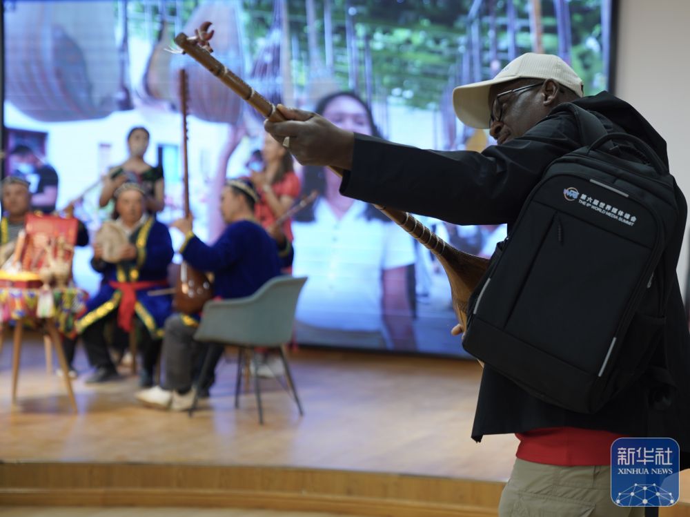 10月15日,與會(huì)嘉賓在阿克蘇地區(qū)新和縣加依村龜茲文化樂(lè)器展示中心與演員互動(dòng)。