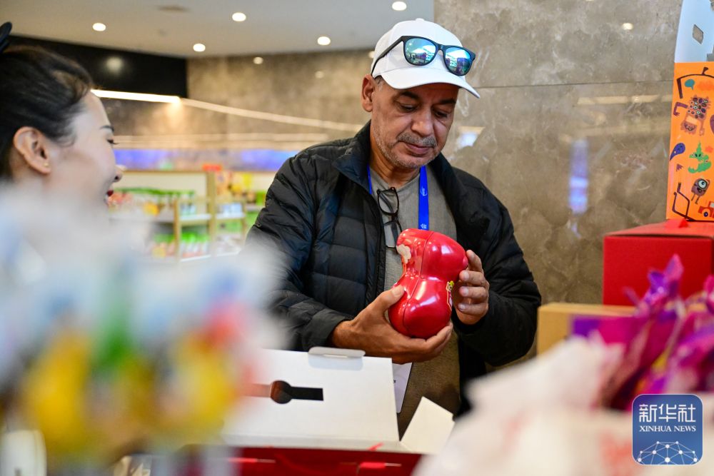 10月15日,與會(huì)嘉賓在新疆喀什跨境電商進(jìn)出口商品展示交易中心購(gòu)買紀(jì)念品。