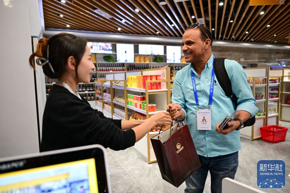 10月15日,與會(huì)嘉賓在新疆喀什跨境電商進(jìn)出口商品展示交易中心購(gòu)物。