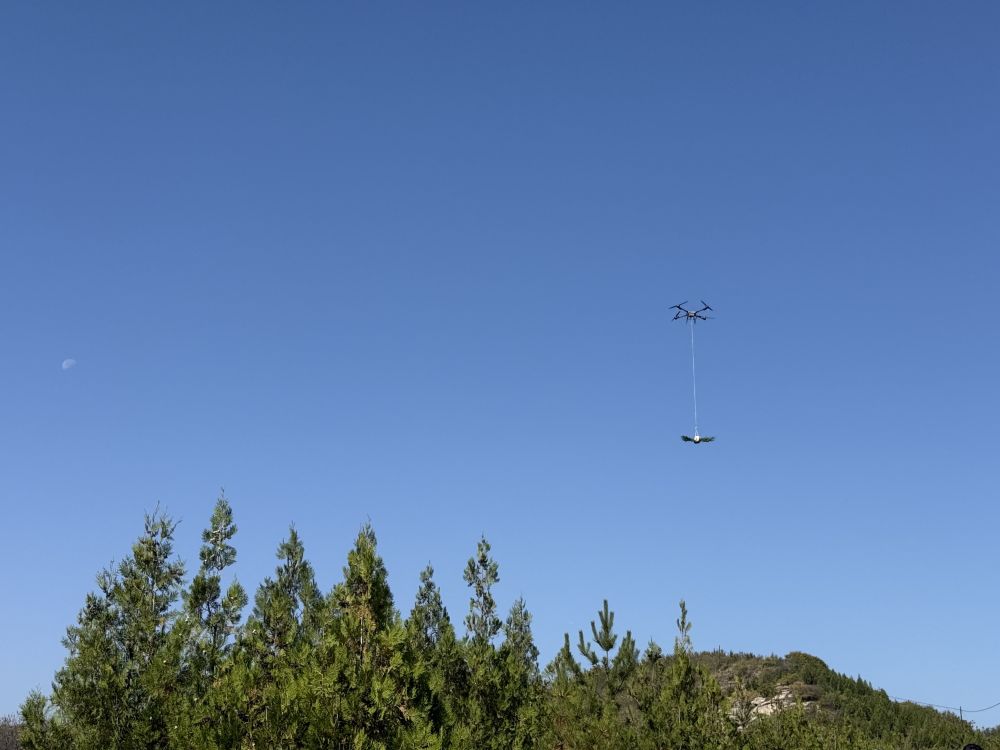 “懸崖造林隊(duì)”隊(duì)員在操作無(wú)人機(jī),將樹苗運(yùn)到另一側(cè)山頭。