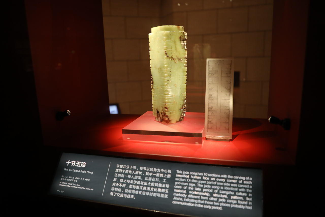 金沙遺址博物館鎮(zhèn)館之寶之一——十節(jié)琮,高22.2厘米,全器分十節(jié),每節(jié)有四個(gè)簡(jiǎn)化的神人面紋,在上端的一面還陰刻有一神人圖案。這件玉琮的質(zhì)地與金沙遺址的其他玉琮完全不同,其造型風(fēng)格、紋樣圖案、制作工藝都與長(zhǎng)江下游的良渚文化一致,應(yīng)是早于金沙1000多年的良渚人的產(chǎn)品。圖片由金沙遺址博物館提供