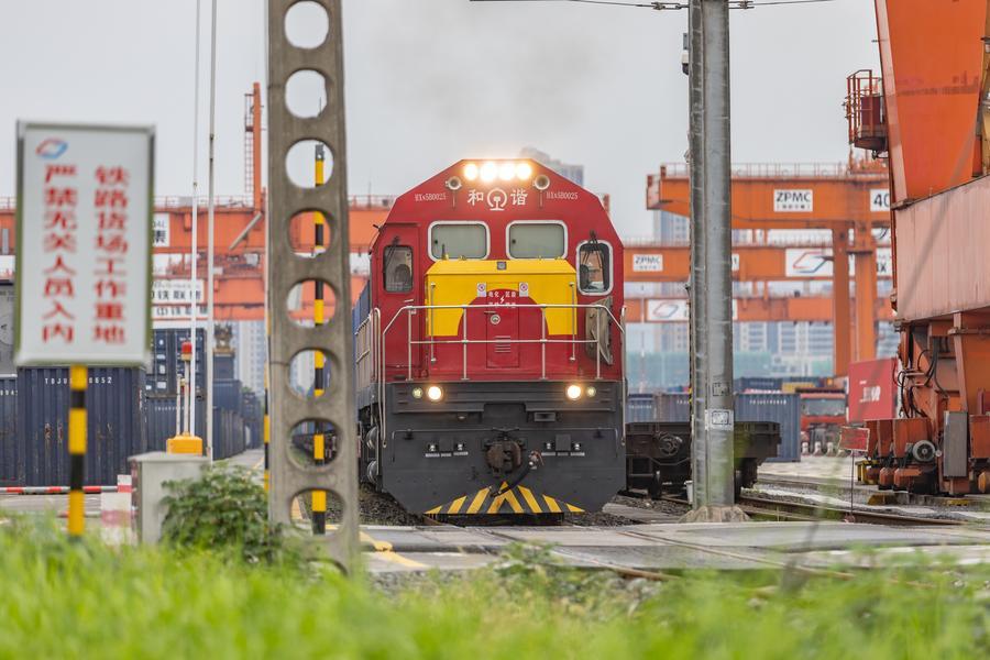 2024年7月30日,在重慶國際物流樞紐園區(qū),一列裝載機械設備、汽車和筆記本電腦的中歐班列從重慶團結村中心站駛出。新華社記者 黃偉 攝