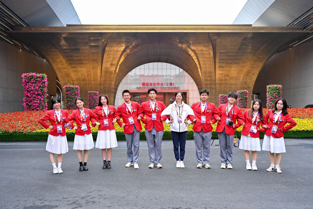 11月4日,志愿者在第七屆中國國際進(jìn)口博覽會(huì)舉辦場(chǎng)地——國家會(huì)展中心(上海)合影。