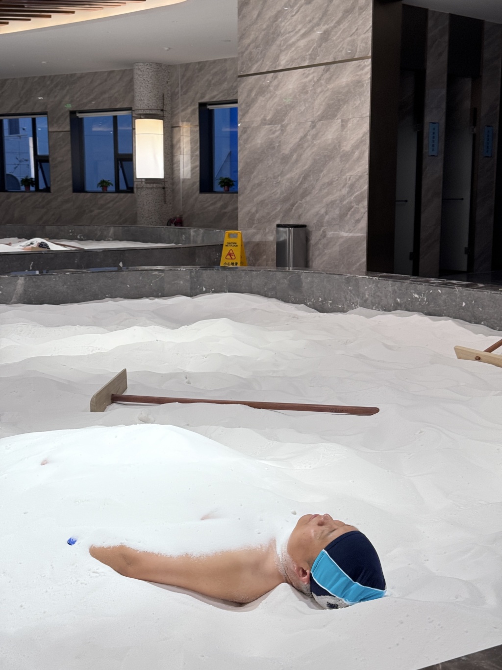 一位游客正在進(jìn)行礦鹽理療,通過礦鹽覆蓋全身以達(dá)到促進(jìn)血液循環(huán)、疏通經(jīng)絡(luò)的作用。 澎湃新聞記者 金向玉 攝