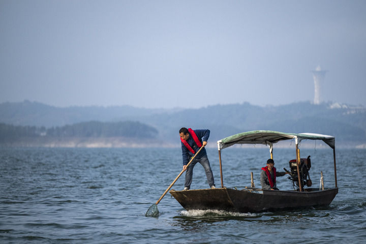 湖北丹江口市清漂隊隊長楊力(左)和清漂隊隊員在丹江口水庫進(jìn)行清漂作業(yè)(2024年10月28日攝)。新華社記者 伍志尊 攝
