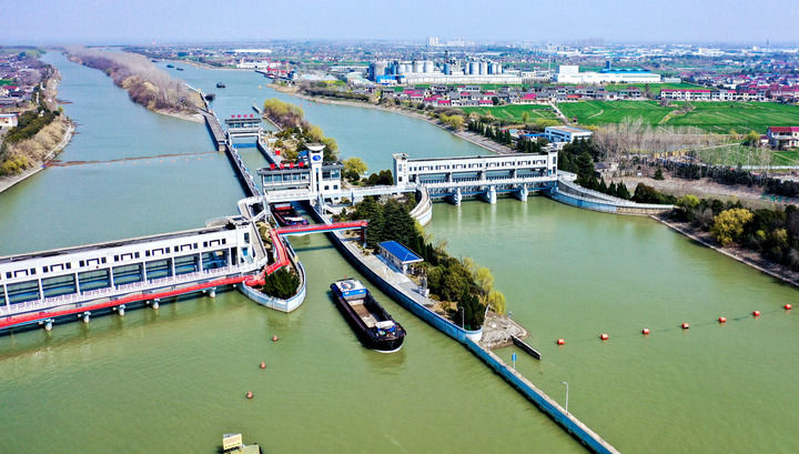 位于江蘇省揚州市江都區(qū)的南水北調(diào)東線一期工程運鹽閘、邵仙套閘、邵仙閘洞(2024年3月19日攝,無人機(jī)照片)。新華社發(fā)(任飛攝)