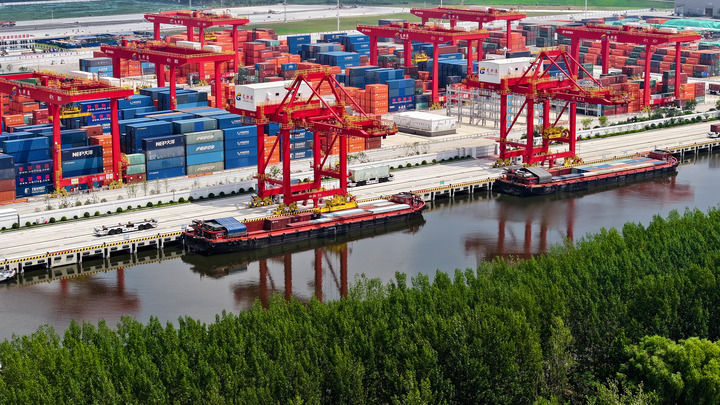 在位于京杭大運河上的山東省濟(jì)寧港航龍拱港,貨船在裝運集裝箱(2024年8月3日攝,無人機(jī)照片)。新華社記者 郭緒雷 攝