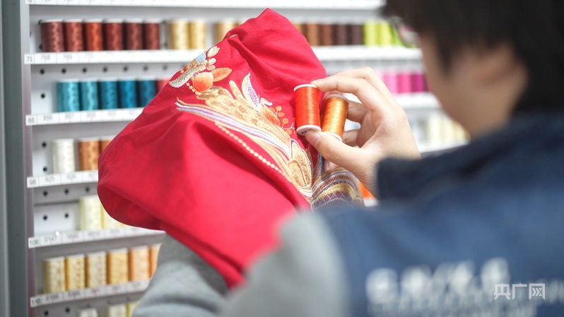 家紡企業(yè)內(nèi),設計師在眾多繡花線中選色(央廣網(wǎng)記者 王姝姝 攝)